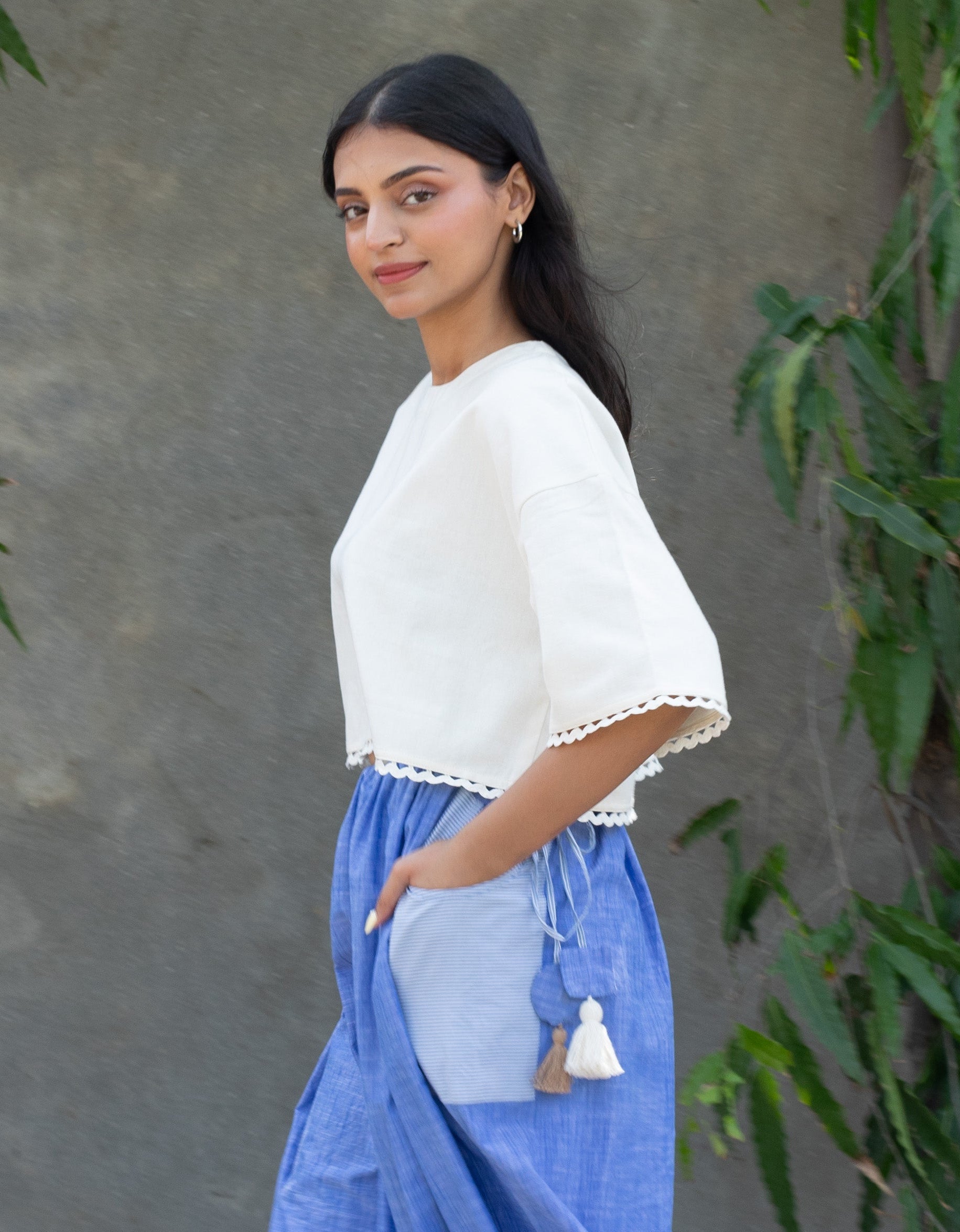 This boxy top is cut easy on the body, finished with a soft scalloped hem that adds just enough detail without taking over.